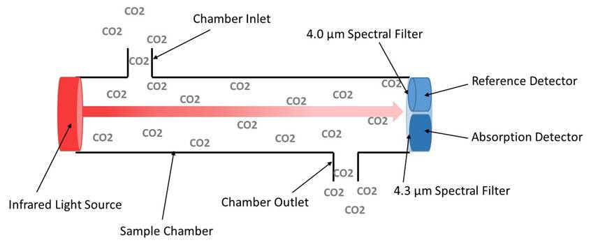 大部分气体能吸收不同波长的红外光并有独特的红外光谱吸收特性,吸收引起的光衰变满足朗伯比尔定律,根据该定律,气体的浓度和特定波长红外光的强度衰减成正比。
